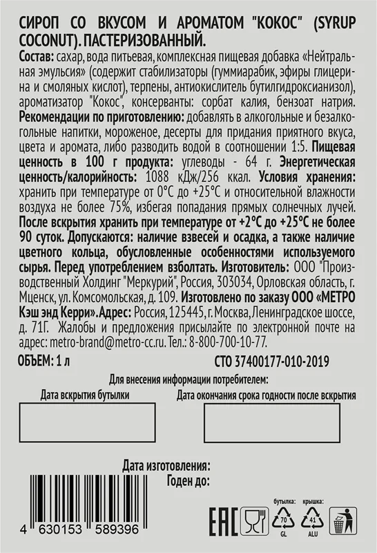Сироп Кокос имеет приятный сладкий вкус. Аромат спелого и сочного кокоса вызывает аппетит. Он отличается средней густотой, имеет белый цвет и подходит для приготовления какао, кофе. Удобная емкость имеет завинчивающуюся крышку, которая надежно защищает от протекания. Мастера кондитеры часто используют такой сироп для пропитывания бисквитов, приготовления кремов, а также в качестве топпинга для запеканок, блинчиков, мороженого. Он подойдет как для массового общественного, так и для домашнего пользования. Продукт расходуется экономно, поэтому его хватает надолго. Кокосовый вкус хорошо сочетается с ананасом, поэтому его используют для приготовления коктейля Пина Коллада.