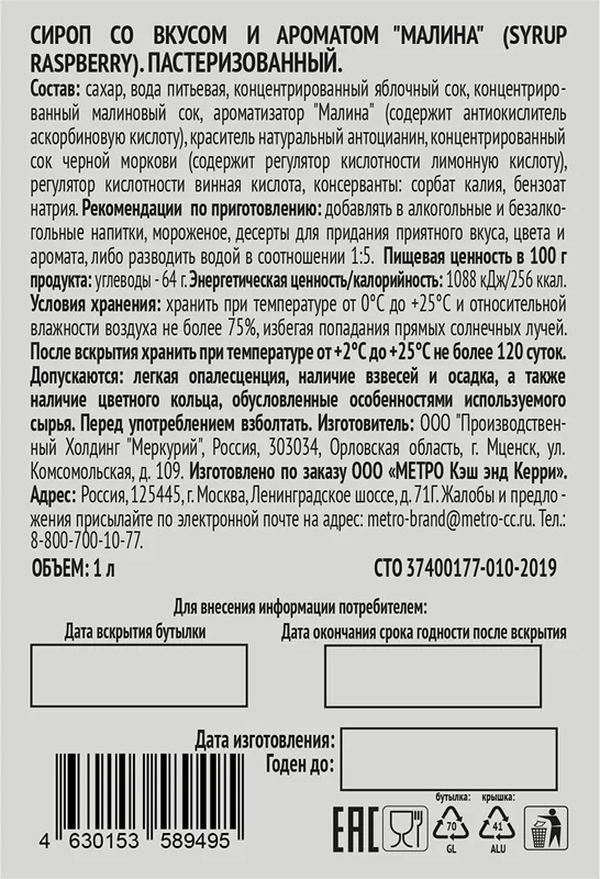 Обладает насыщенным ароматом и концентрированным вкусом ягод с освежающей легкой кислинкой. Он предназначен для приготовления коктейлей, может использоваться в качестве сладкого соуса, подходит для добавления в мороженое, прочие десерты. Сироп имеет насыщенный цвет и однородную консистенцию.
