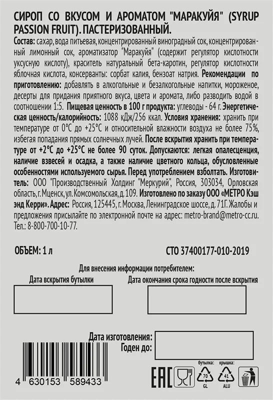 Сироп Маракуйя обладает насыщенным ароматом и концентрированным вкусом с освежающей легкой кислинкой. Он предназначен для приготовления коктейлей, может использоваться в качестве сладкого соуса, подходит для добавления в кофе, мороженое и десерты. Сироп имеет насыщенный цвет и приятную консистенцию. Он помещен во вместительную бутылку из безопасного материала объемом 0,7 л. Продукт легко извлечь из упаковки и аккуратно дози??овать его, не допуская разбрызгивания.
