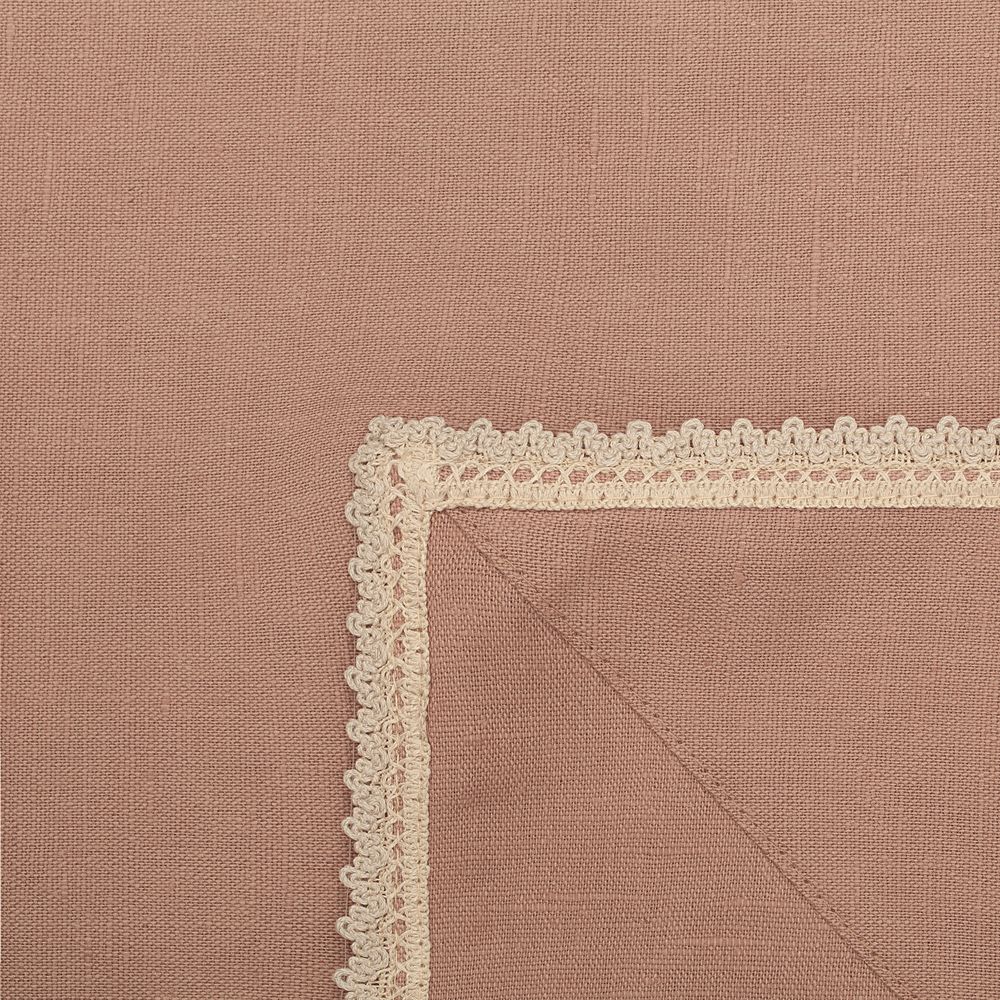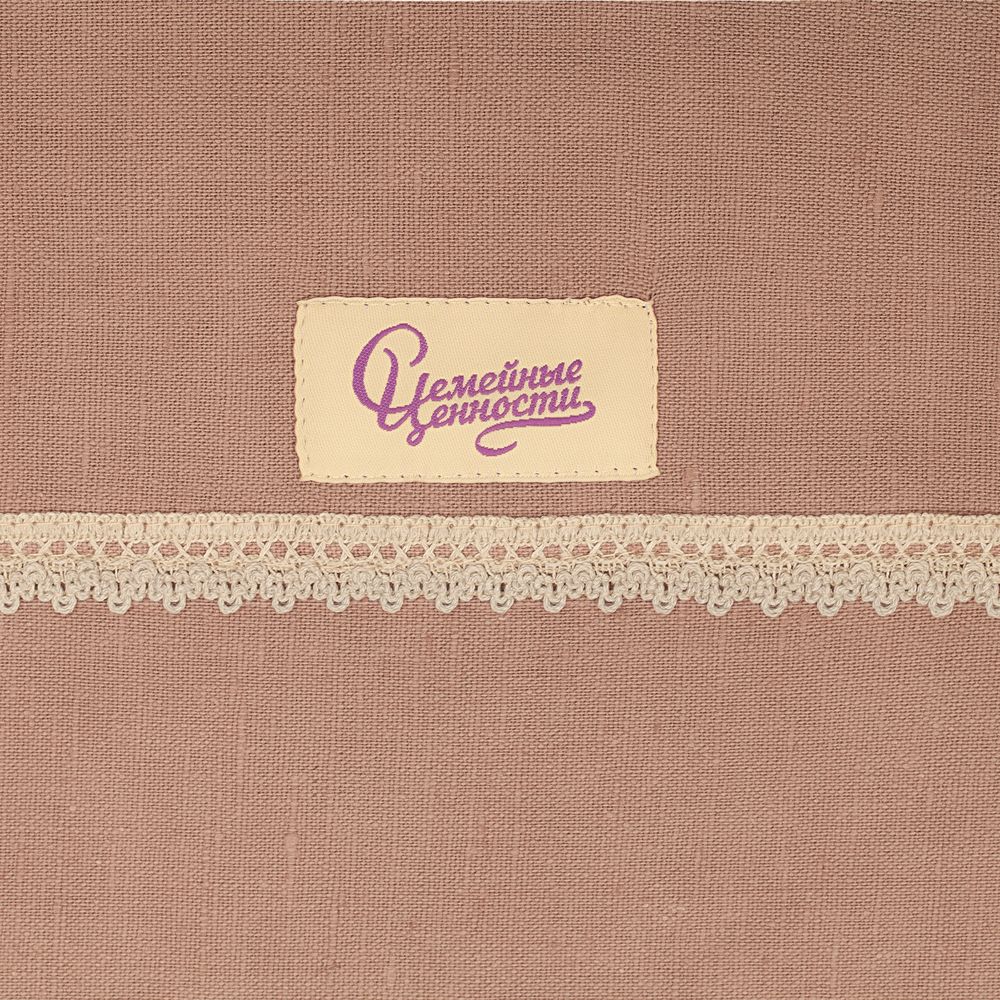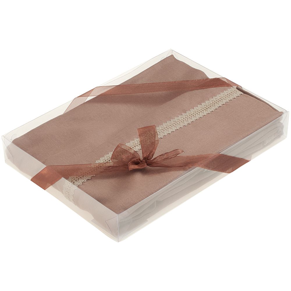 Скатерть с отделкой из льняного кружева. Поставляется в подарочной упаковке. Цвет - коричневый. Размер: 150х180 см. Материал: лен, 57%; хлопок, 43%.