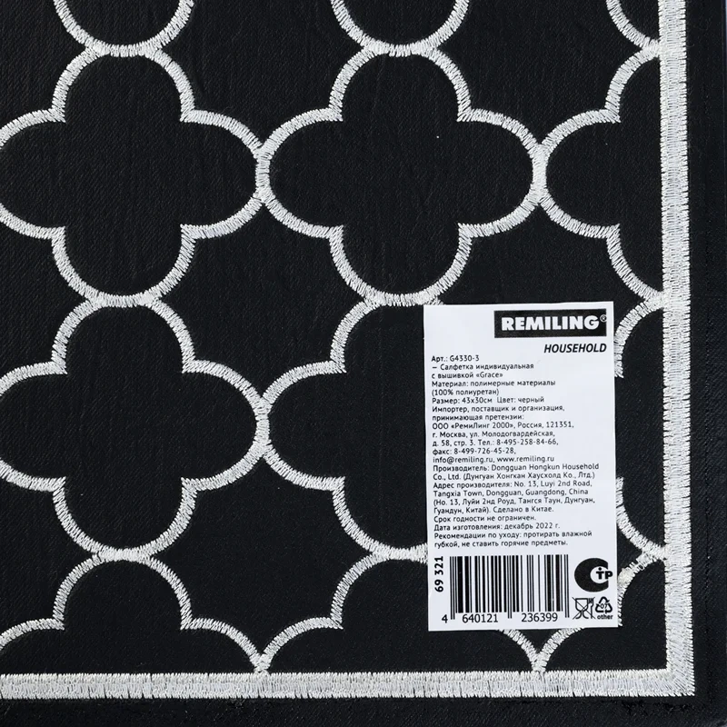Салфетка Remiling Household Grace черный с вышивкой, 43 x 30см