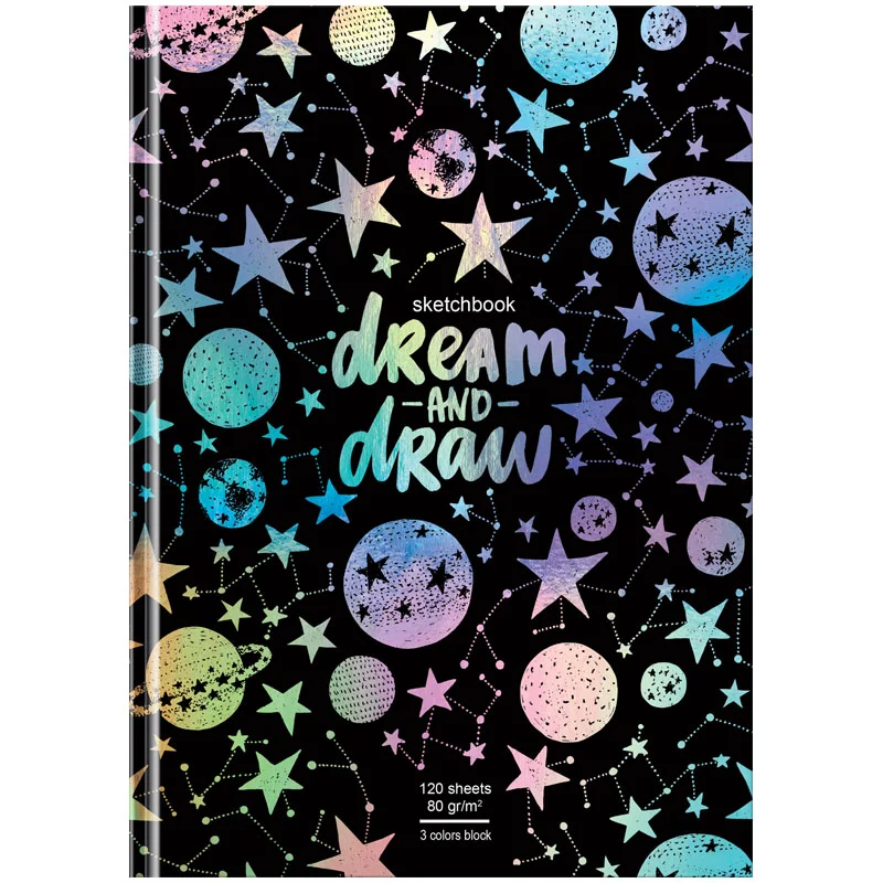Скетчбук BG серии «Мечтай и рисуй» удобного формата А5 и размера 151*211 мм со стильным ярким изображением планет и звёзд является прекрасным помощником в создании эскизов и быстрых набросков. Твёрдая обложка (7БЦ) выполнена из картона с матовой ламинацией и выборочным лаком. Внутренний блок состоит из 120 нелинованных листов офсетной бумаги 3 цветов (бежевый, розовый, салатовый) и плотностью 80 г/кв. м. Прошитый блок делает использование тетради для эскизов комфортным и надёжным. Все рисунки и записи будут храниться в одном месте.