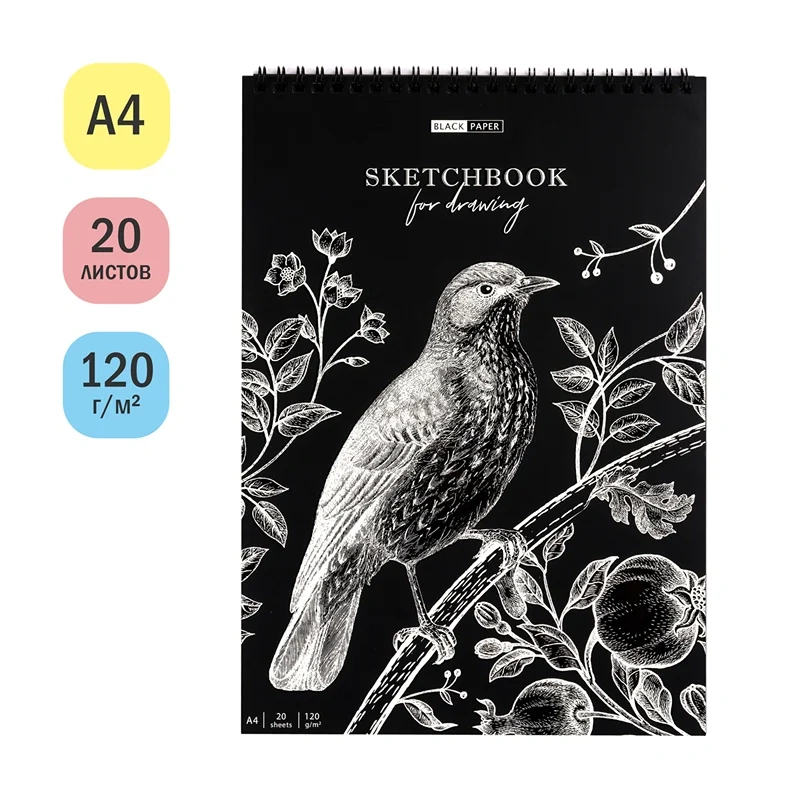 Скетчбук ArtSpace Black line. Bird состоит из 20 листов формата А4 и имеет внутренний блок черного цвета и плотностью бумаги 120 г/м. Она отлично подходит для рисования пастелью, восковыми мелками, акрилом, акварельными карандашами, гуашью и тушью белых и других светлых цветов. Скрепление «гребень» даёт возможность раскрывать скетчбук на 360 градусов.