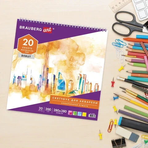 Скетчбук, акварельная белая бумага 200 г/м2 ГОЗНАК, 280х280 мм, 20 листов, гребень подложка, BRAUBER