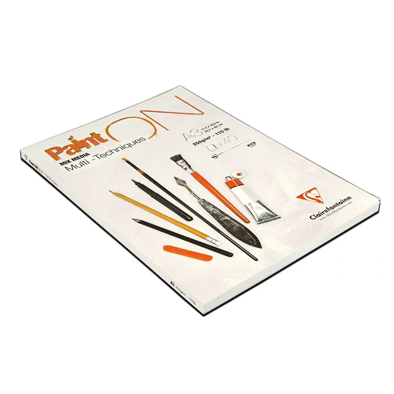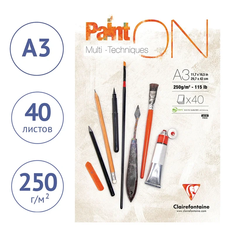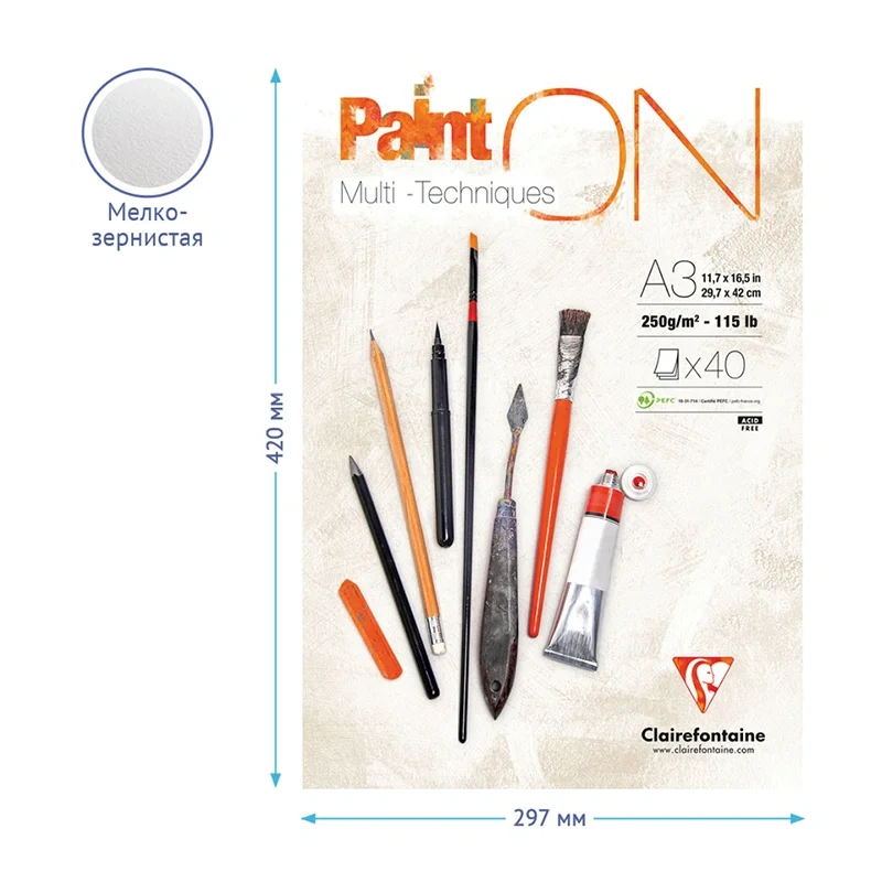 Альбом для смешанных техник Clairefontaine Paint'ON на склейке. Плотность блока: 250 г/кв.м. Размер: 297*420 мм. Текстура внутреннего блока: зернистая. Материал обложки: картон. Альбом для смешанных техник Paint'ON – лучшая линейка от французского производителя Clairefontaine. Бумага имеет хорошую поглощающую способность и адаптирована к сухим методам рисования (карандаш, фломастер), а также к мокрым техникам (гуашь, акрил). Вид крепления – склейка, позволяет легко отделить лист с готовым рисунком.