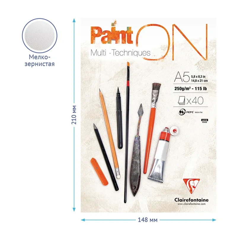 Альбом для смешанных техник Clairefontaine Paint'ON на склейке. Плотность блока: 250 г/кв.м. Размер: 148*210 мм. Назначение: для смешанных техник. Текстура внутреннего блока: зернистая. Материал обложки: картон. Альбом для смешанных техник Paint'ON – лучшая линейка от французского производителя Clairefontaine. Бумага имеет хорошую поглощающую способность и адаптирована к сухим методам рисования (карандаш, фломастер), а также к мокрым техникам (гуашь, акрил). Вид крепления – склейка, позволяет легко отделить лист с готовым рисунком.
