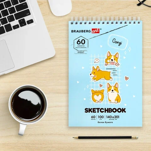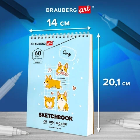 Скетчбук, белая бумага 100 г/м2, 140х201 мм, 60 л., гребень, жёсткая подложка, BRAUBERG ART, 'Корги'
