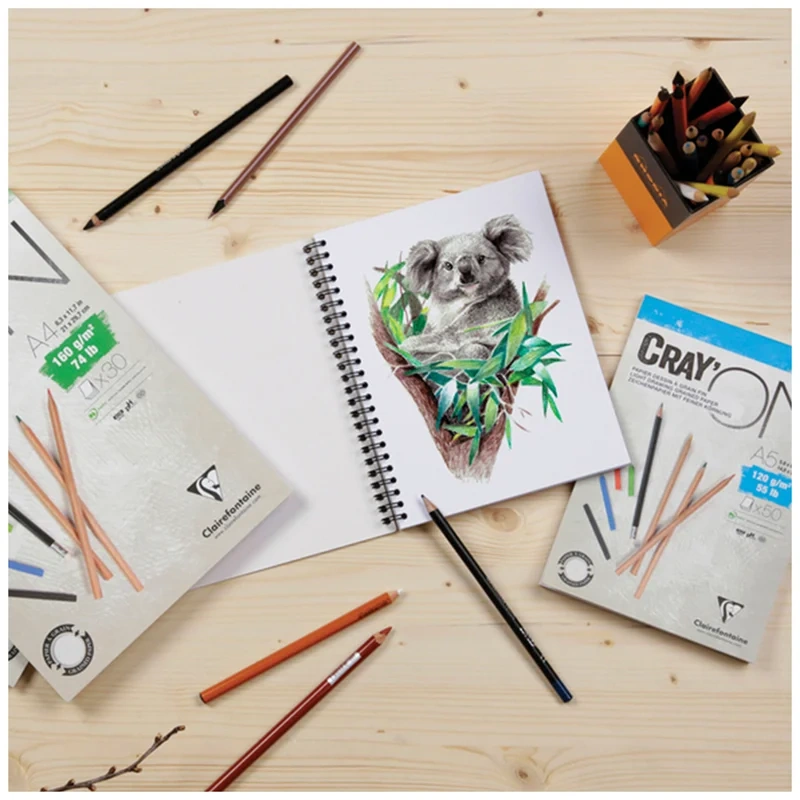 Скетчбук-блокнот Clairefontaine серии «Cray'ON» формата А3 размером 297*420 мм состоит из 50 листов. Плотность 120 г/м2 подходит для рисунков (набросков) и черчения. Бескислотная 100% целлюлозная бумага позволяет многократно вносить исправления в ваш набросок, при этом блок не повреждается. Внутренний блок – белый, имеет две разные поверхности: гладкую и мелкозернистую.