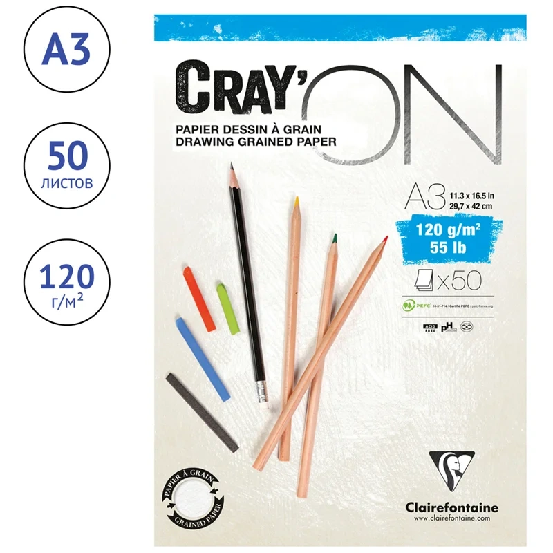 Скетчбук - блокнот 50л., А3 Clairefontaine 'Cray ON', на склейке, 120г/м2, мелкозерн.