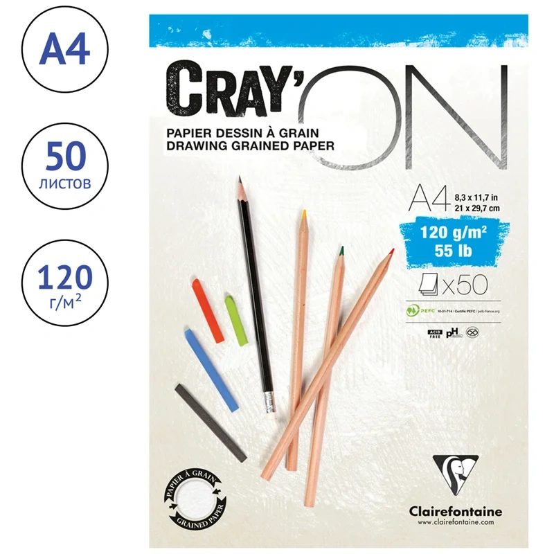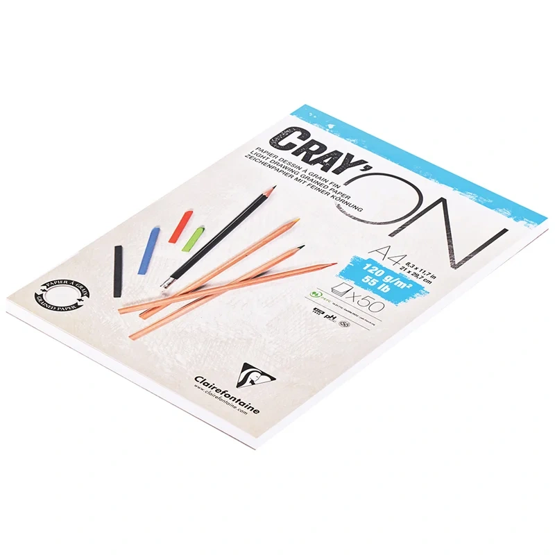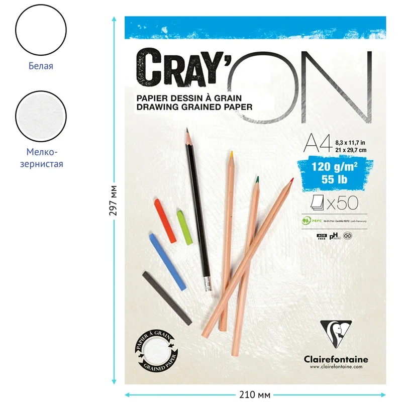 Скетчбук-блокнот Clairefontaine серии «Cray'ON» формата А4 размером 210*297 мм состоит из 50 листов. Плотность 120 г/м2 подходит для рисунков (набросков) и черчения. Бескислотная 100% целлюлозная бумага позволяет многократно вносить исправления в ваш набросок, при этом блок не повреждается. Внутренний блок – белый, имеет две разные поверхности: гладкую и мелкозернистую.