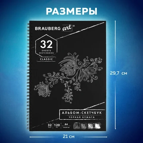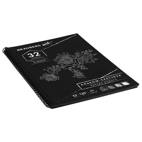 Скетчбук, черная бумага 120 г/м2, 210х297 мм, 32 л., гребень, BRAUBERG ART 'CLASSIC', 128951