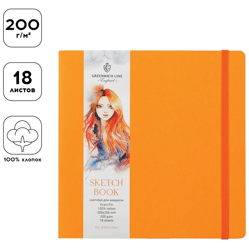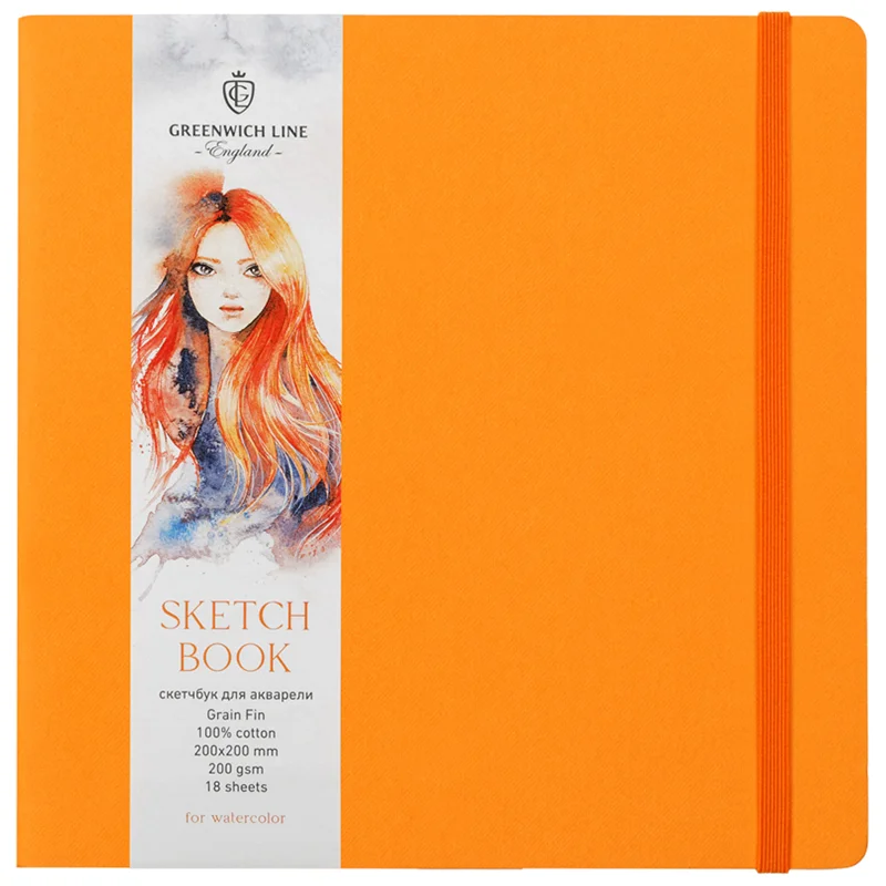 Скетчбук для акварели 18л., 200*200 Greenwich Line, оранжевый, 100% хлопок, 200г/м2, на резинке