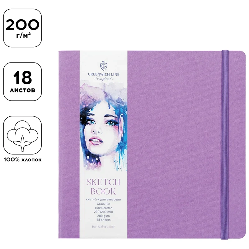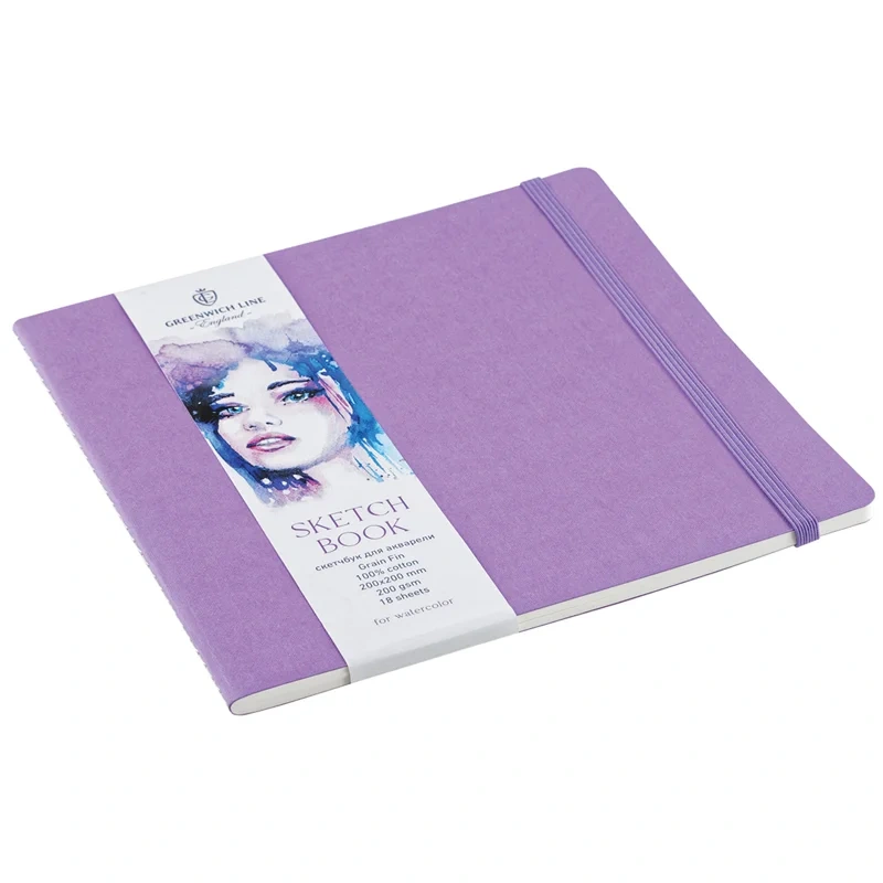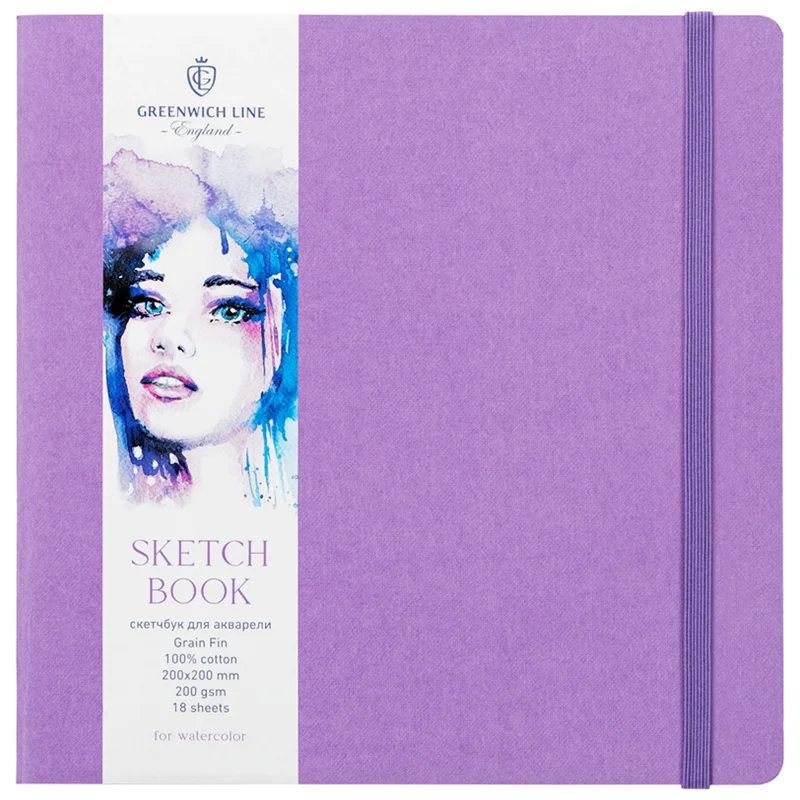 Скетчбук для акварели 18л., 200*200 Greenwich Line, сиреневый, 100% хлопок, 200г/м2, на резинке
