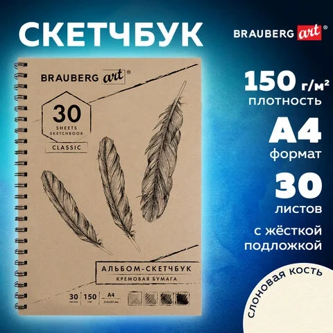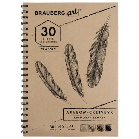 Скетчбук, слоновая кость 150 г/м2, 210х297 мм, 30 л., гребень, BRAUBERG ART 'CLASSIC', 128947