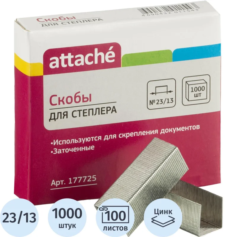 Скобы для степлера № 23/13 Attache предназначены для степлеров со сшивающей способностью от 70 до 100 листов (для бумаги толщиной 0.07 и 0.08 мм). Скобы № 23/13 выполнены из металла с цинковым покрытием. 1000 скоб в картонной пачке. В промежуточной упаковке — 10 пачек по 1000 скоб.