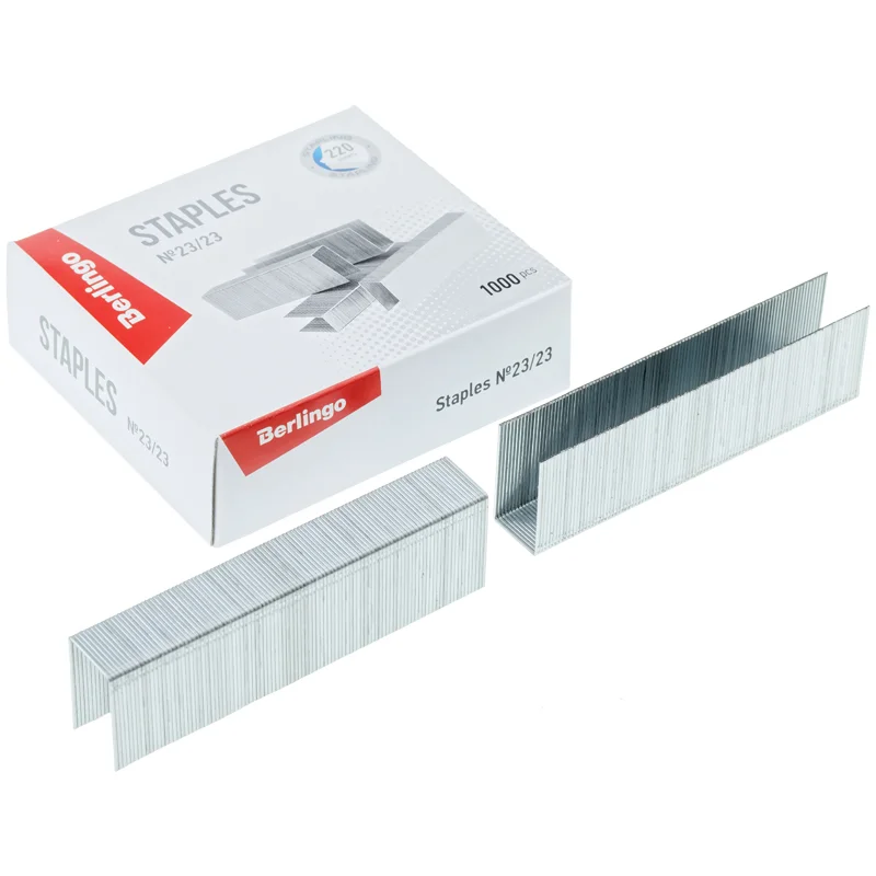 Скобы канцелярские № 23/23 Berlingo оцинкованные отлично подойдут для скрепления листов бумаги. Скобы упакованы в картонную коробочку по 1000 штук. Канцелярские скобы изготовлены из стальной проволоки, а усиленный металл с покрытием из цинка предотвращает появление коррозии. Меньший диаметр проволоки со специальной заточкой обеспечивает надежное сшивание до 220 листов. Благодаря специальному клею скобы не крошатся и не рассыпаются при падении.