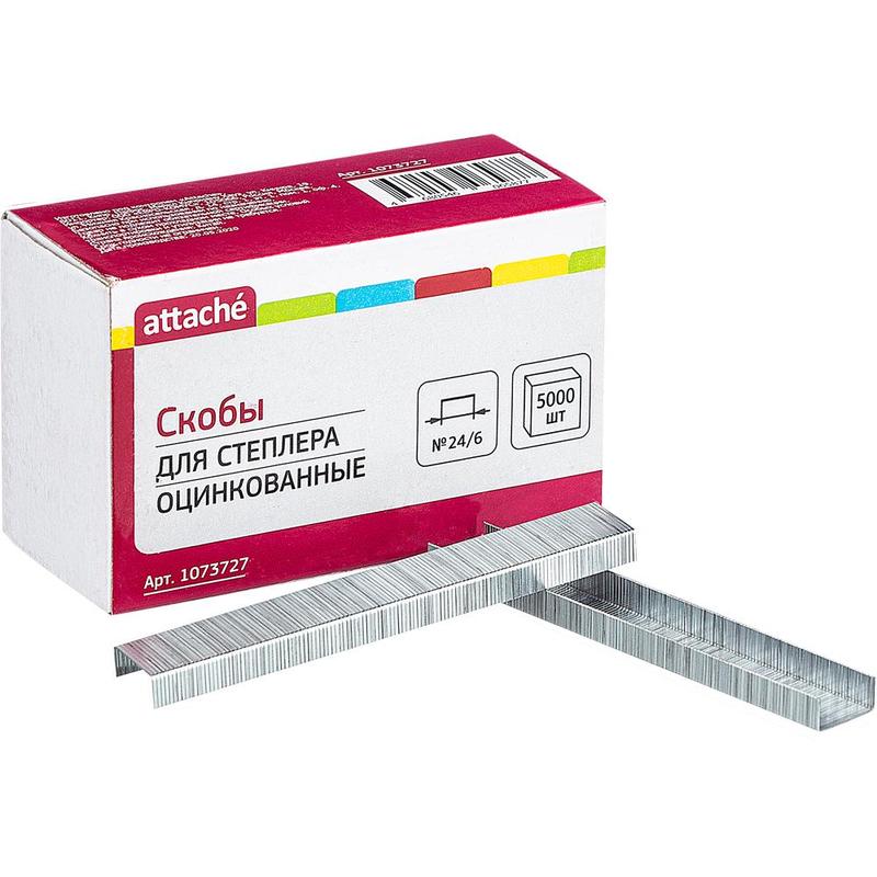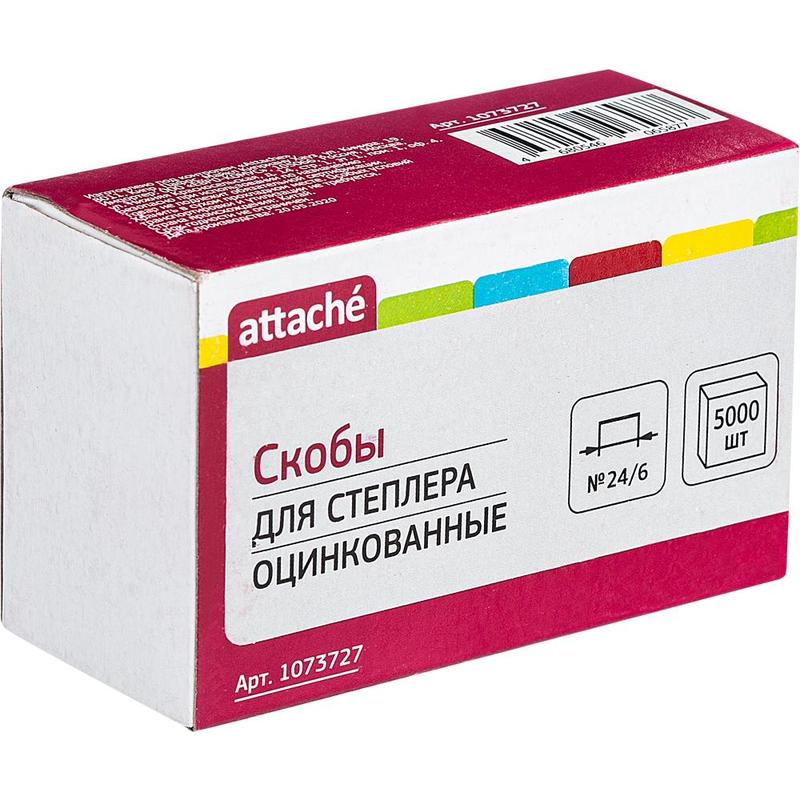 Скобы для степлера № 24/6 Attache предназначены для степлеров со сшивающей способностью от 2 до 30 листов. Скобы № 24/6 выполнены из металла с цинковым покрытием. 5000 скоб в картонной пачке. В транспортной упаковке — 100 пачек по 5000 скоб.