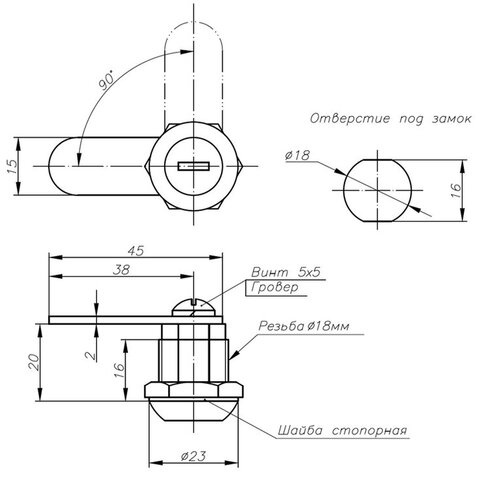 Замок почтовый EU, длина 20 мм, d - 18,5 мм, 90 градусов, фиксатор ключа, изогнутый ригель, гайка, 3