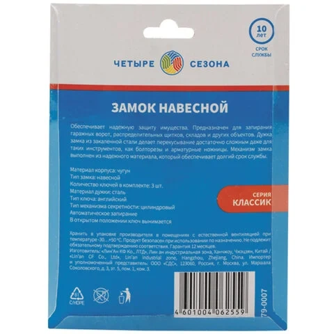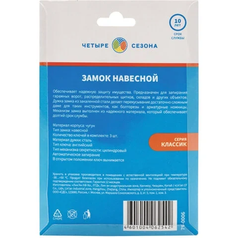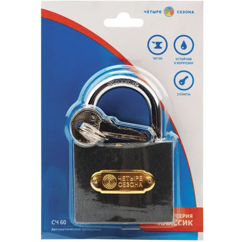 Замок навесной, ширина 60 мм, чугун, дужка d-8,4 мм, английский, 3 ключа, ЧЕТЫРЕ СЕЗОНА, в блистере,