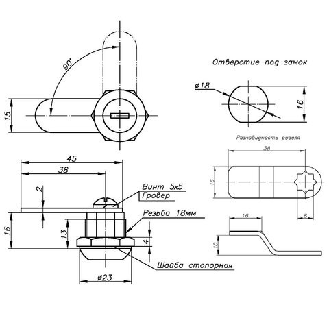 Замок почтовый Banggu, длина 16 мм, d - 17,5 мм, 90 градусов, прямой ригель, гайка, 3497