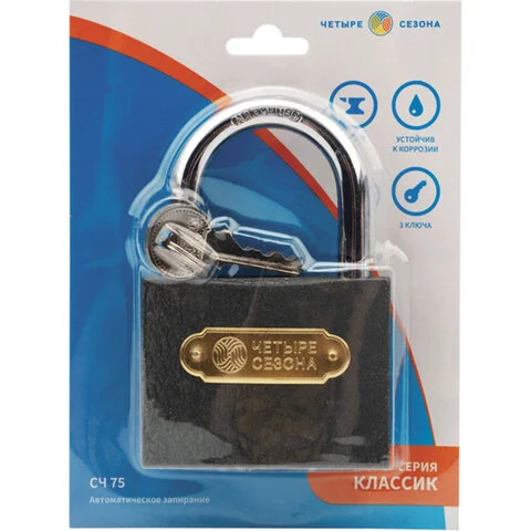 Замок навесной, ширина 75 мм, чугун, дужка d-9,5 мм, английский, 3 ключа, ЧЕТЫРЕ СЕЗОНА, в блистере,
