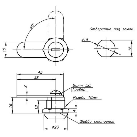 Замок почтовый EU, длина 20 мм, d - 18,5 мм, 90 градусов, прямой ригель, гайка, 718448