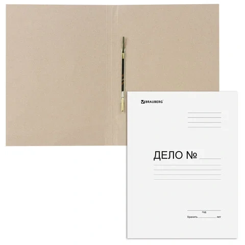Подходит для документов формата А4 и меньше. Изготовлен из белого мелованного картона плотностью 300 г/м2. Оснащен металлическим механизмом сшивания. Вмещает до 200 листов стандартной плотности. Имеет надпись 'Дело №' на обложке. Поставляется в гофрокоробе.