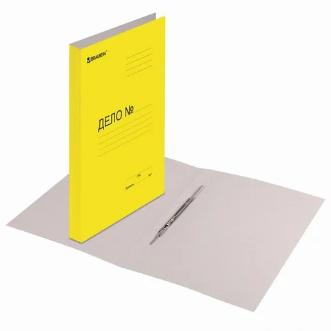 Подходит для документов формата А4 и меньше. Изготовлен из желтого мелованного картона плотностью 360 г/м2. Оснащен металлическим механизмом сшивания. Вмещает до 200 листов стандартной плотности. Имеет надпись 'Дело №' на обложке. Поставляется в гофрокоробе.