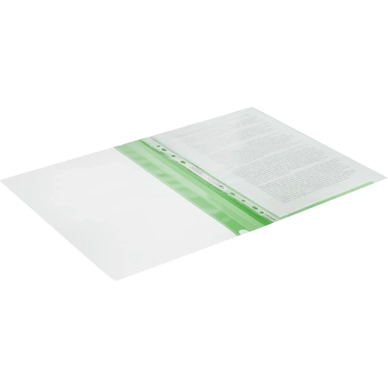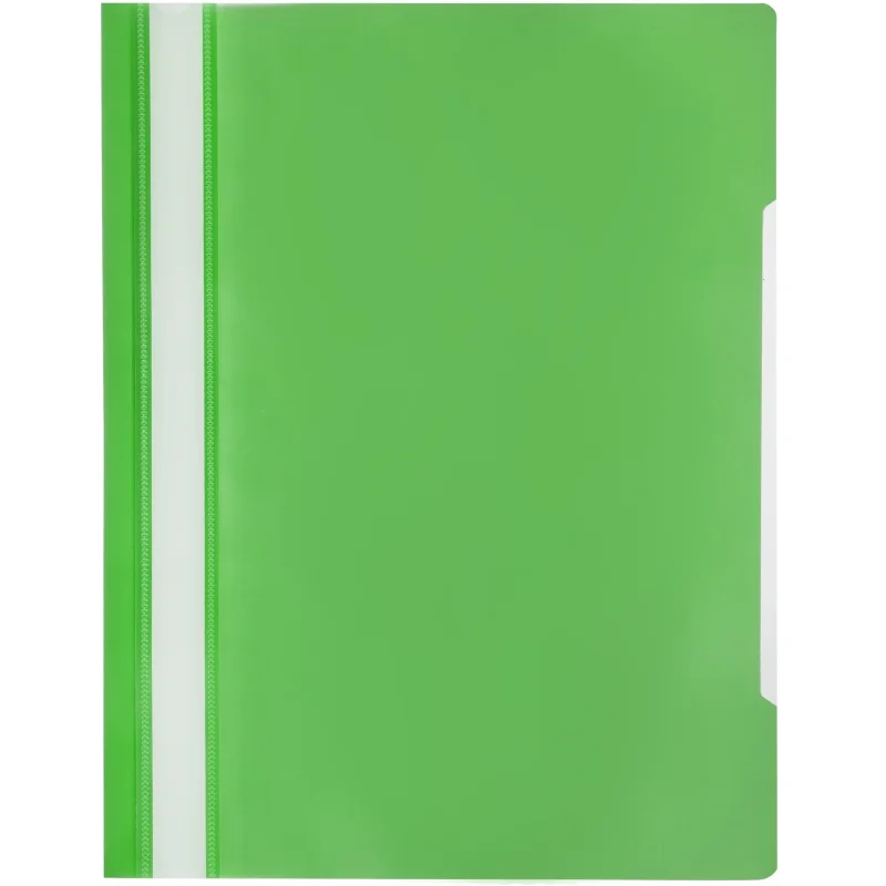 Скоросшиватель Attache используется для хранения различного рода документации, для ведения документооборота, систематизации договоров, других важных бумаг. Формат А4. Папка изготовлена из гладкого пластика. Толщина верхнего прозрачного листа — 150 мкм, нижнего цветного листа — 180 мкм. На лицевой стороне находится карман с белой бумажной полосой для указания содержания, вместимость — 100 листов стандартной плотности. Цвет — зелёный.
