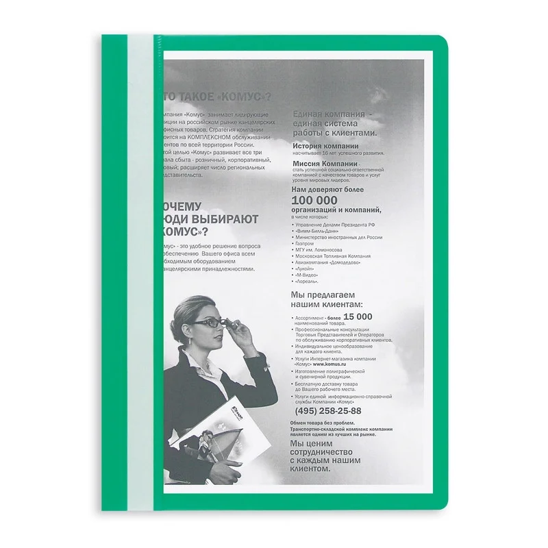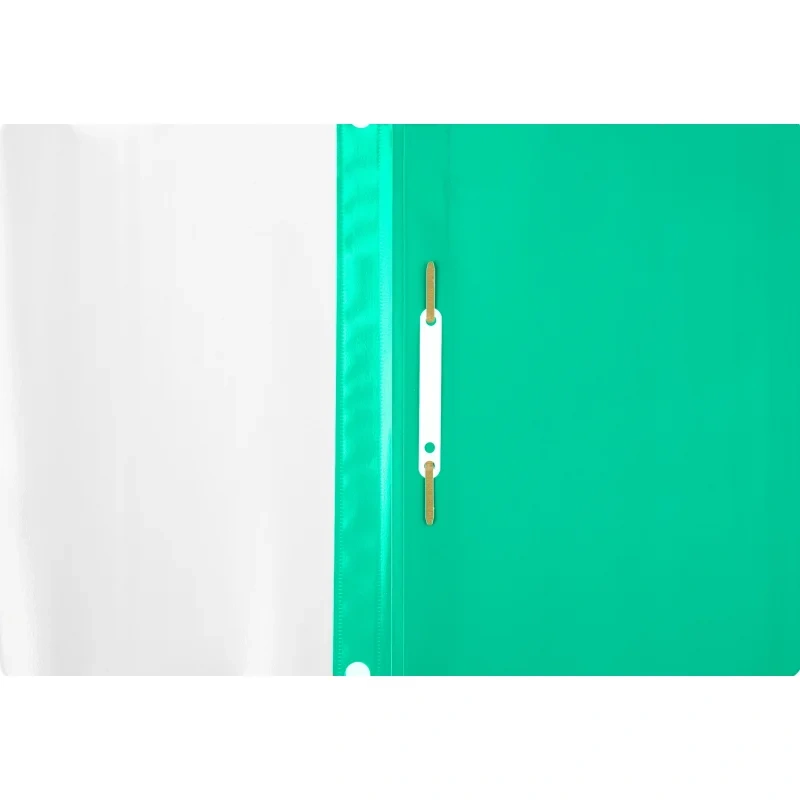 Скоросшиватель используется для хранения различного рода документации, для ведения документооборота, систематизации договоров, других важных бумаг. Папка изготовлена из мягкого пластика. Фактура — «апельсиновая корка». Толщина верхнего прозрачного листа — 130 мкм, нижнего цветного листа — 150 мкм. С прозрачной верхней обложкой. На лицевой стороне находится карман с белым бумажной полосой для указания содержания, вместимость — 100 листов стандартной плотности. Цвет — зеленый