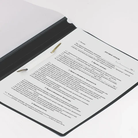 Фиксирует до 100 листов формата А4. Толщина пластика верхнего листа составляет 130 мкм, а нижнего - 180 мкм. Предельно простой механизм подшивки: металлические усики и пластиковая планка для надежной фиксации документов. Скоросшиватель изготовлен из качественного полипропилена. Прозрачный верхний лист позволяет определить содержимое, не открывая скоросшиватель, который к тому же снабжен сменным пластиковым корешком, что дает возможность структурировать информацию. Благодаря фактуре 'песок' и строгому черному цвету обложки папка никогда не затеряется на полке.