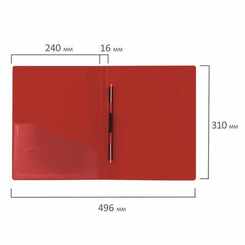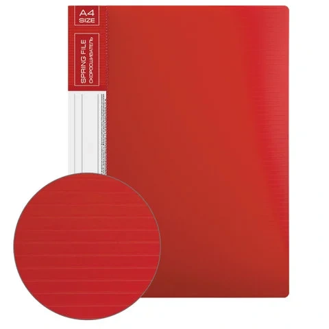 Изготовлена из высококачественного пластика красного цвета толщиной 0,7 мм с оригинальной линейной фактурой. Обеспечивает хранение до 100 листов формата А4. Металлический скоросшиватель с пружинным механизмом обеспечит надежную фиксацию документов. Кроме того, папка снабжена прозрачным внутренним карманом. Для идентификации имеется сменный бумажный корешок. Поставляется в индивидуальной упаковке.