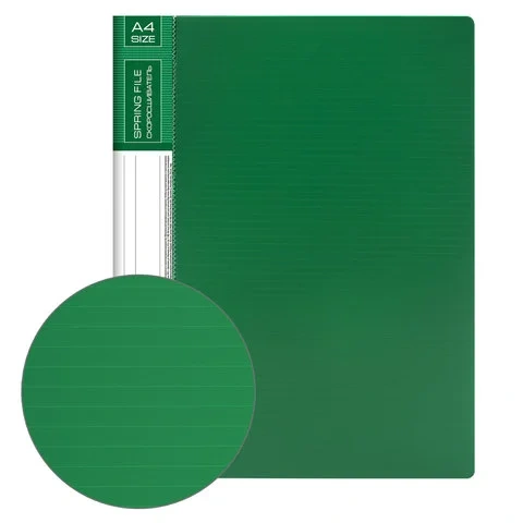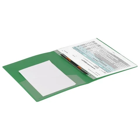 Изготовлена из высококачественного пластика зеленого цвета толщиной 0,7 мм с оригинальной линейной фактурой. Обеспечивает хранение до 100 листов формата А4. Металлический скоросшиватель с пружинным механизмом обеспечит надежную фиксацию документов. Кроме того, папка снабжена прозрачным внутренним карманом. Для идентификации имеется сменный бумажный корешок. Поставляется в индивидуальной упаковке.