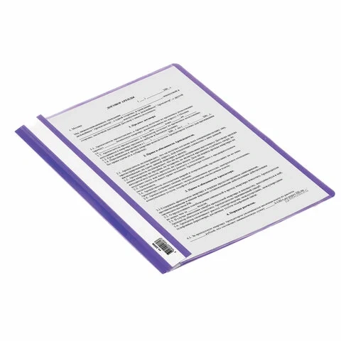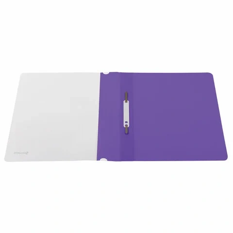 Фиксирует до 100 листов формата А4. Толщина пластика верхнего листа составляет 130 мкм, а нижнего - 180 мкм. Предельно простой механизм подшивки: металлические усики и пластиковая планка для надежной фиксации документов. Скоросшиватель изготовлен из качественного полипропилена. Прозрачный верхний лист позволяет определить содержимое, не открывая скоросшиватель, который к тому же снабжен сменным пластиковым корешком, что дает возможность структурировать информацию. Благодаря фактуре 'песок' и яркому фиолетовому цвету обложки папка никогда не затеряется на полке.