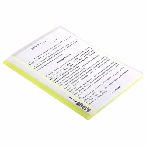 Папка-скоросшиватель формата А4 из высококачественного пластика с текстурой поверхности 'апельсиновая корка', на которой не видно отпечатков пальцев и мелких царапин. Цвет папки – ассорти: желтый, зеленый, оранжевый, розовый. Механизм – механический скоросшиватель. Папка вмещает до 130 бумажных листов. Размер – 312х230 мм, толщина верхнего листа – 0,12 мм, толщина нижнего листа – 0,14 мм.