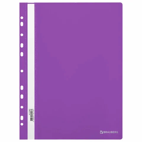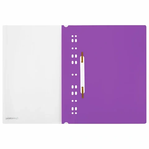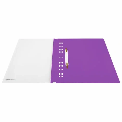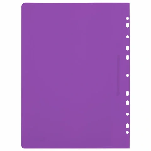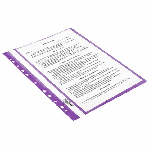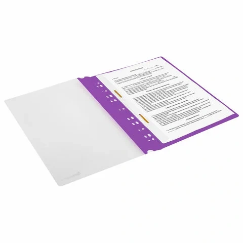 Прозрачный верхний лист позволяет идентифицировать подшитый документ, не открывая скоросшиватель. Сменный пластиковый корешок помогает структурировать информацию. Благодаря фактуре 'песок' и яркому фиолетовому цвету обложки папка никогда не затеряется на полке.