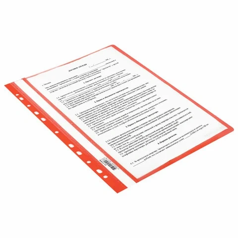 Прозрачный верхний лист позволяет идентифицировать подшитый документ, не открывая скоросшиватель. Сменный пластиковый корешок помогает структурировать информацию. Благодаря фактуре 'песок' и яркому красному цвету обложки папка никогда не затеряется на полке.