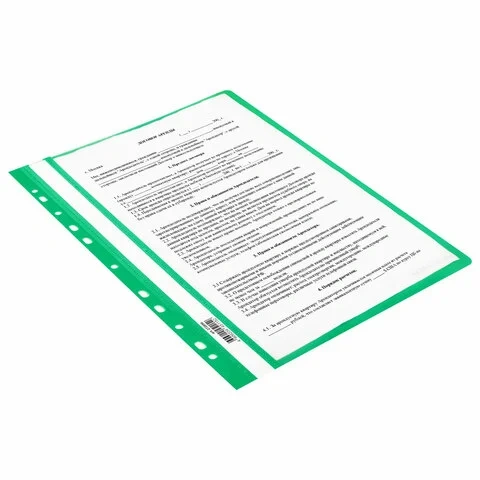 Прозрачный верхний лист позволяет идентифицировать подшитый документ, не открывая скоросшиватель. Сменный пластиковый корешок помогает структурировать информацию. Благодаря фактуре 'песок' и яркому зелёному цвету обложки папка никогда не затеряется на полке.