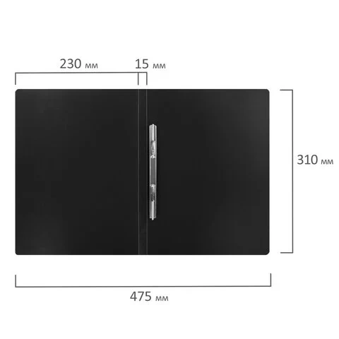 Фиксирует до 100 листов формата А4. Предельно надежный способ подшивки: металлические усики и пружинный механизм для крепкой фиксации документов. Скоросшиватель изготовлен из качественного пластика толщиной 500 мкм. Благодаря фактуре 'песок' и насыщенному черному цвету обложки папка никогда не затеряется на полке. Размер - 230х310 мм. Поставляется в индивидуальной упаковке.