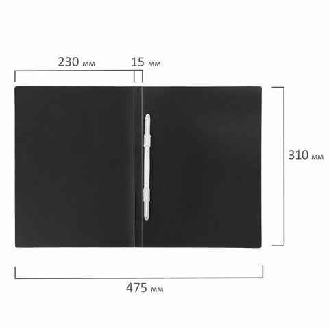 Фиксирует до 100 листов формата А4. Предельно простой и надежный механизм подшивки. Скоросшиватель изготовлен из качественного непрозрачного пластика толщиной 500 мкм. Благодаря фактуре 'песок' и черному цвету обложки папка никогда не затеряется на полке. Размер - 230х310 мм. Поставляется в индивидуальной упаковке.