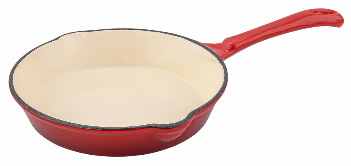 Чугунная эмалированная сковорода диаметром 20 см (20х4 см), цвет - красный. Предназначена для приготовления пищи, подходит для использования в духовке. Вес изделия составляет 1,5 кг.