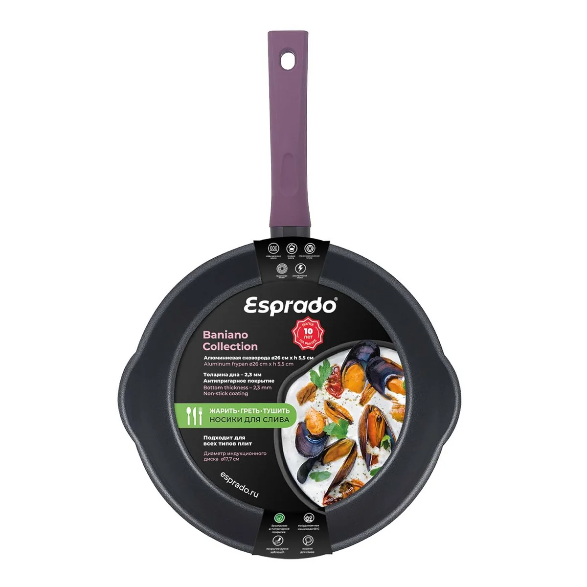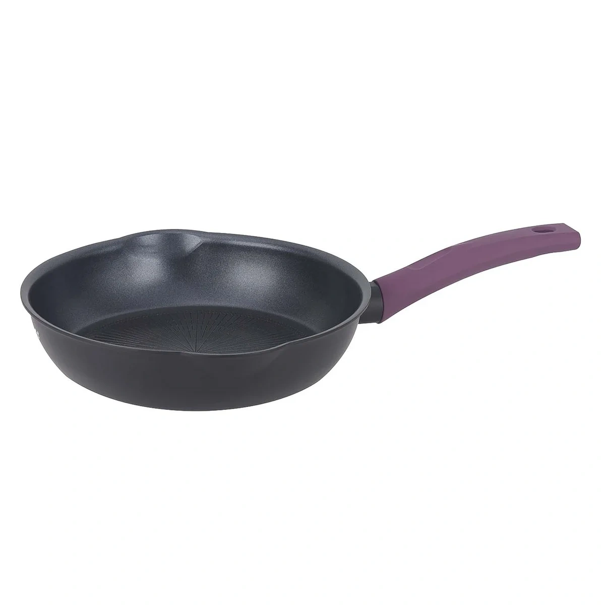 Коллекция сковород Baniano - это то, что поразит своим удобством! Высокие бортики, большая рабочая поверхность и носики для слива жидкости будут вам помогать в готовке. Двухслойное антипригарное покрытие Pfluon Cookmark порадует вас своей безопасностью, экологичностью и отсутствием вредной PFOA кислоты. Дно сковороды имеет рельефные полосы, благодаря которым масло при жарке будет распределяться равномерно, а при тушении появится эффект воздушной подушки. Продукты не будут пригорать. Сковорода окрашена в черный цвет, который надолго сохранит внешний вид, а ее ручка в темно-фиолетовый оттенок, напоминающий цвет баклажана. В коллекции сковороды диаметром от 18 до 28 см. Подходит для всех типов плит, в том числе индукционных. Можно мыть в посудомоечной машине.