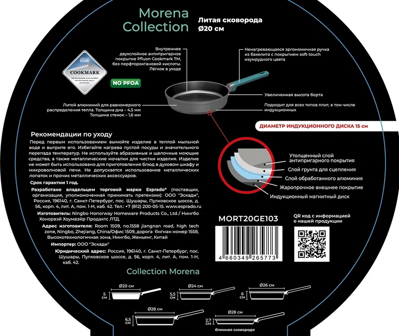Сковорода Morena диаметром 20см и глубиной 6см благодаря толстому литому корпусу и увеличенной площади поверхности дна станет любимицей на Вашей кушне. Надёжное сертифицированное покрытие от одного из крупнейших производителей - компании Pfluon обладает отличными антипригарными свойствами и высокой устойчивостью к истиранию, благодаря чему, при правильном использовании сковорода будет служить долгие годы. Отсутствие вредной перфтороктановой кислоты (PFOA free) делает её безопасной для человека и окружающей среды. Немаркое чёрное внутреннее и внешнее покрытие позволит сохранить первозданный вид сковороды надолго, а приятный сине-зелёный цвет ручки придаст эксклюзивный вид Вашей посуде. Увеличенная глубина и толщина стенок позволят сковороде дольше остывать, благодаря чему при тушении возникнет эффект томления. Ненагревающаяся эргономичная ручка удобно ляжет в руку, а мягкое покрытие soft-touch обеспечит приятное прикосновение. Подходит для всех типов плит, в том числе индукционной. Можно мыть в посудомоечной машине.