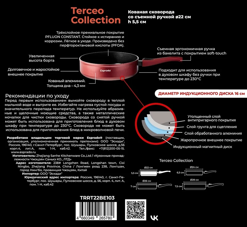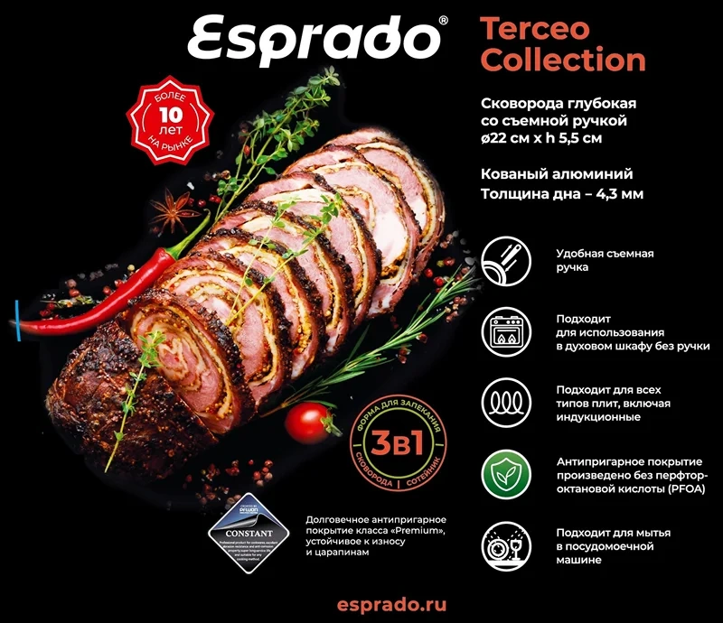 Сковорода глубокая 3 в 1 Terceo подойдут ценителям универсальных решений и обладателям небольших кухонь. Многофункциональную глубокую сковороду 3-в-1 также можно использовать в качестве сотейника и формы для запекания. Благодаря съемной ручке Вы сможете использовать эти сковороды в духовке (при температуре до 230?C), а при хранении – экономить место. Утолщенное индукционное дно обеспечит равномерный нагрев, а трехслойное премиальное антипригарное покрытие Pfluon Constant – безопасное использование на долгий срок. Эффектный цвет внешнего покрытия и съемная ручка с эффектом Soft-touch позволят получать еще больше удовольствия от процесса приготовления. Esprado – сохраняем тепло!