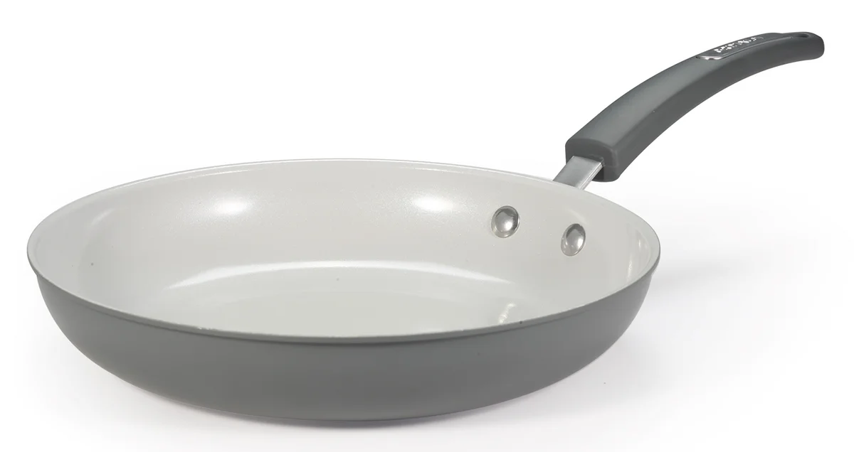 Сковорода из алюминия диаметром 26 см с керамическим покрытием Excilon. Цвет - серый. Толщина стенок составляет 2,5 мм.