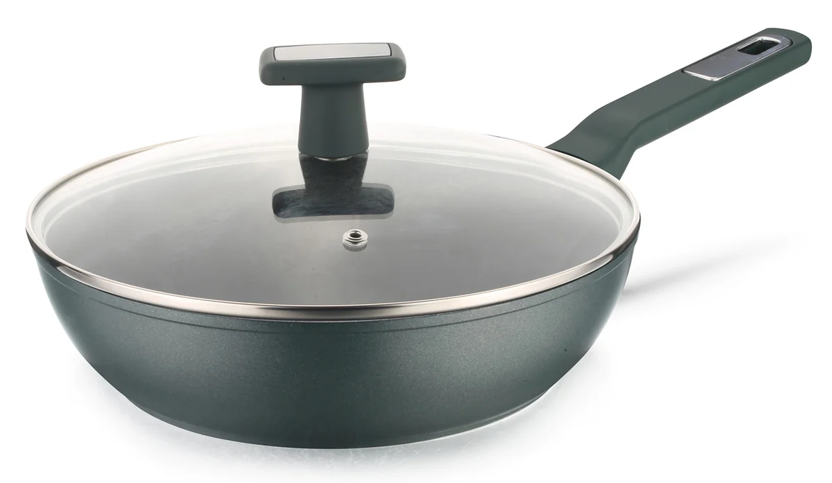 Сковорода из кованного алюминия диаметром 24 см (24х6,5 см) с керамическим покрытием Excilon и стеклянной крышкой. Цвет - оливковый. Толщина стенок составляет 4 мм, а толщина дна - 3,1 мм.
