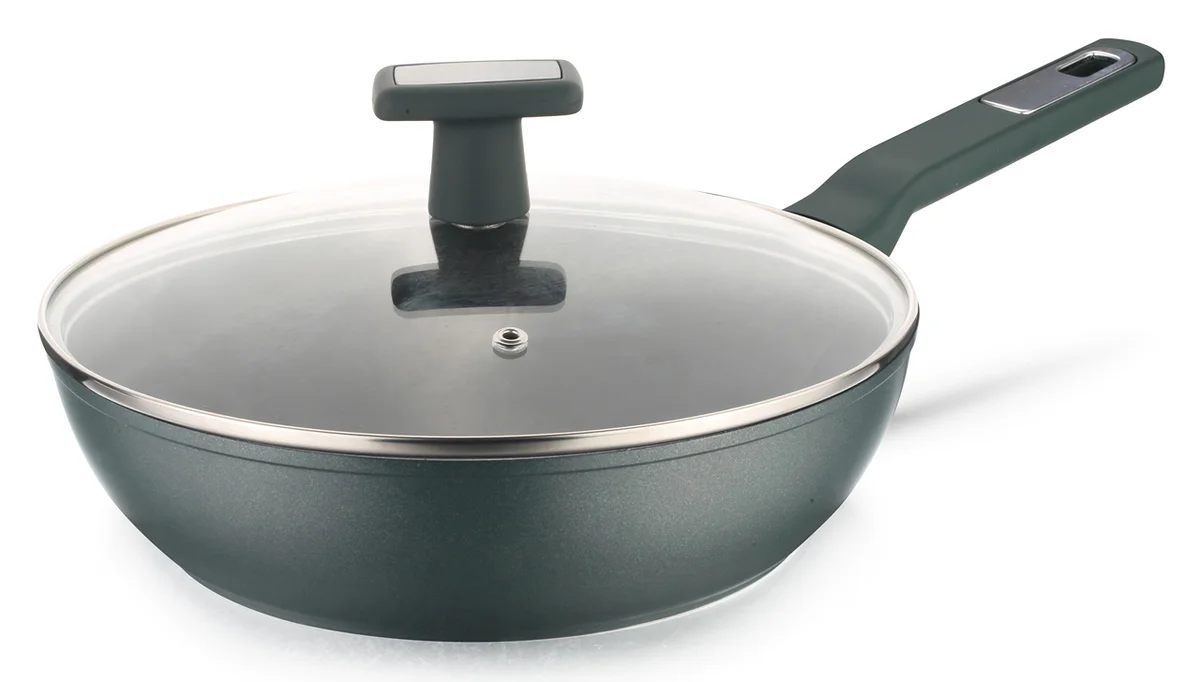 Сковорода из кованного алюминия диаметром 28 см (28х7,5 см) с керамическим покрытием Excilon и стеклянной крышкой. Цвет - оливковый. Толщина стенок составляет 4 мм, а толщина дна - 3,1 мм.