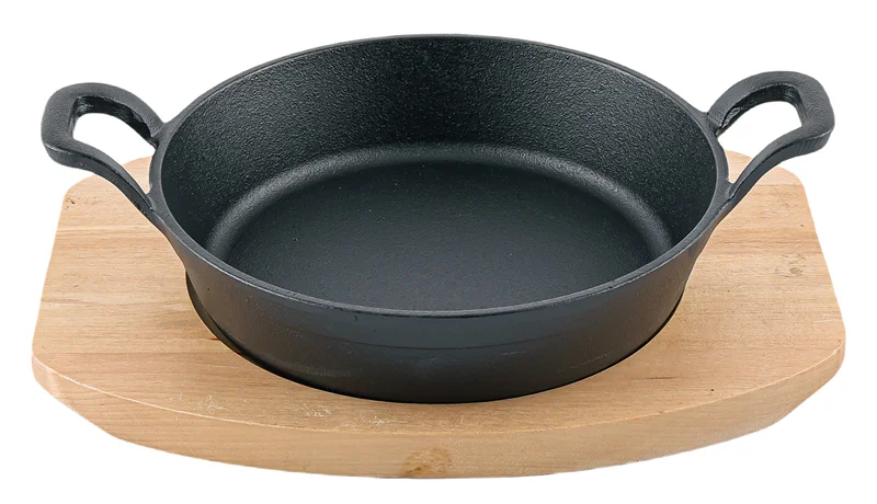 Сковорода-гриль овальная чугунная 18см на деревянной подставке. Цвет - черный. Жаропрочность до 260С. Подходит для всех видов плит, в том числе индукционных. Можно использовать в духовке. Нельзя мыть в посудомоечной машине. Размеры кастрюли (г x ш x в, диаметр): 22 x 15 x4см, 15. Вес - 1,3кг. Оригинальная сервировка стола усиливает положительное впечатление от вкуса пищи. Чугунная сковорода на деревянной подставке станет лучшим способом подачи лакомств из мяса и рыбы.