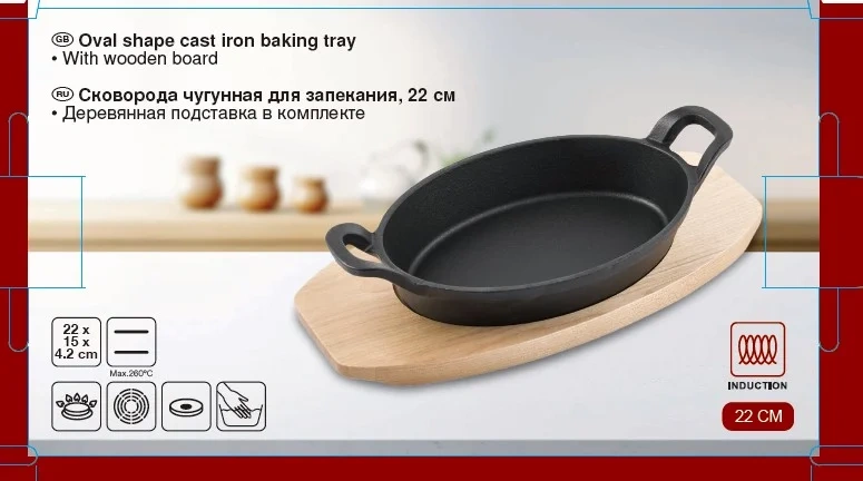 Сковорода-гриль овальная чугунная 22см на деревянной подставке. Цвет - черный. Жаропрочность до 250С. Подходит для всех видов плит, в том числе индукционных. Можно использовать в духовке. Нельзя мыть в посудомоечной машине. Размеры кастрюли (г x ш x в, диаметр): 24 x 18 x6см, 15. Вес - 1,5кг. Оригинальная сервировка стола усиливает положительное впечатление от вкуса пищи. Чугунная сковорода на деревянной подставке станет лучшим способом подачи лакомств из мяса и рыбы.
