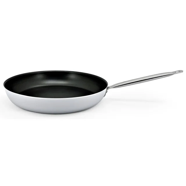 METRO PROFESSIONAL Сковорода Deep, 40 см идеально подходит для приготовления мяса, рыбы, овощей. Она имеет диаметр 40 сантиметров и изготовлена из качественных материалов. Благодаря прочному алюминию сковорода долговечна и устойчива к повреждениям. На ее поверхности есть антипригарное покрытие, которое облегчает очистку и предотвращает пригорание. Готовьте на ней оладьи, запеканки, жаркое, тушите мясо и овощи или еще что-то. Ухаживайте за сковородой правильно, чтобы она прослужила долго. Не используйте сухие чистящие средства и губки с абразивными частицами, которые могут испортить покрытие. Также не стоит ставить горячий прибор на мокрую или холодную поверхность — это может привести к его деформации. Сковорода имеет термоаккумулирующее дно, которое равномер??о распределяет тепло и обеспечивает идеальную прожарку. Ее можно использовать в духовке при температуре до 220 градусов.